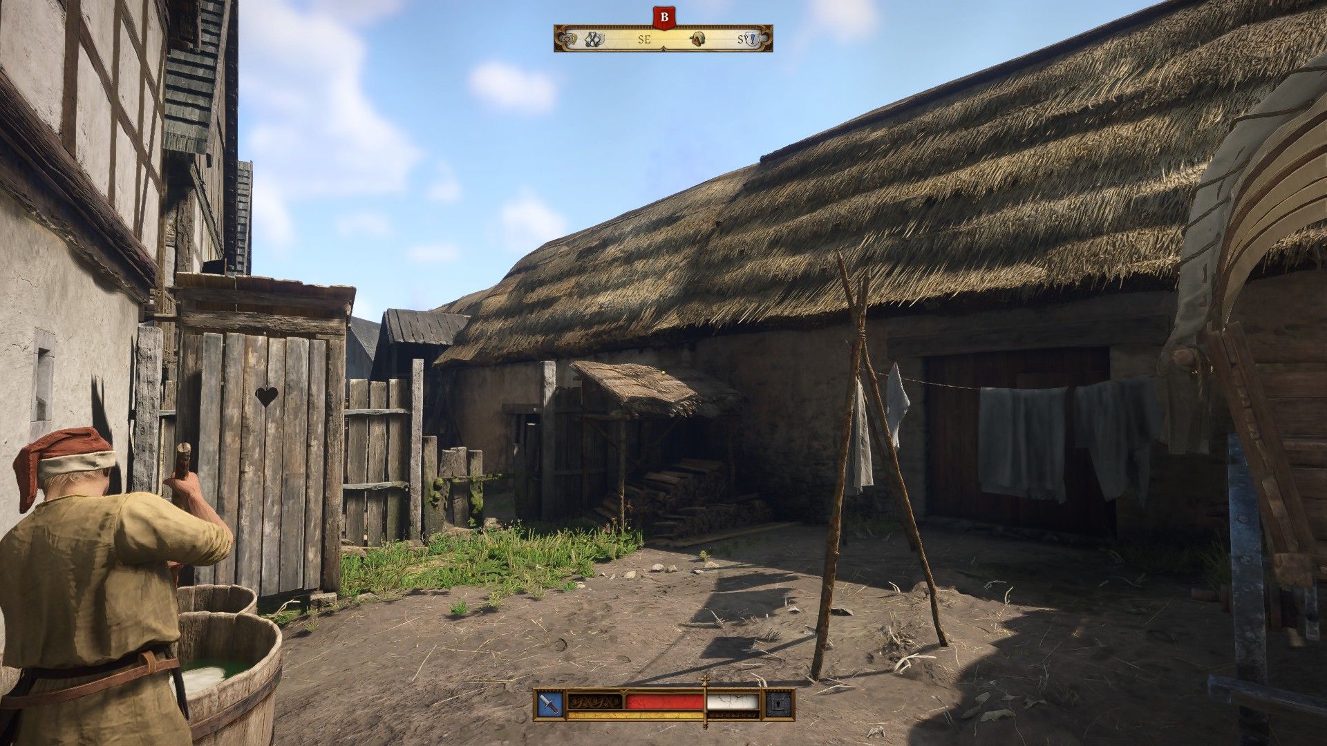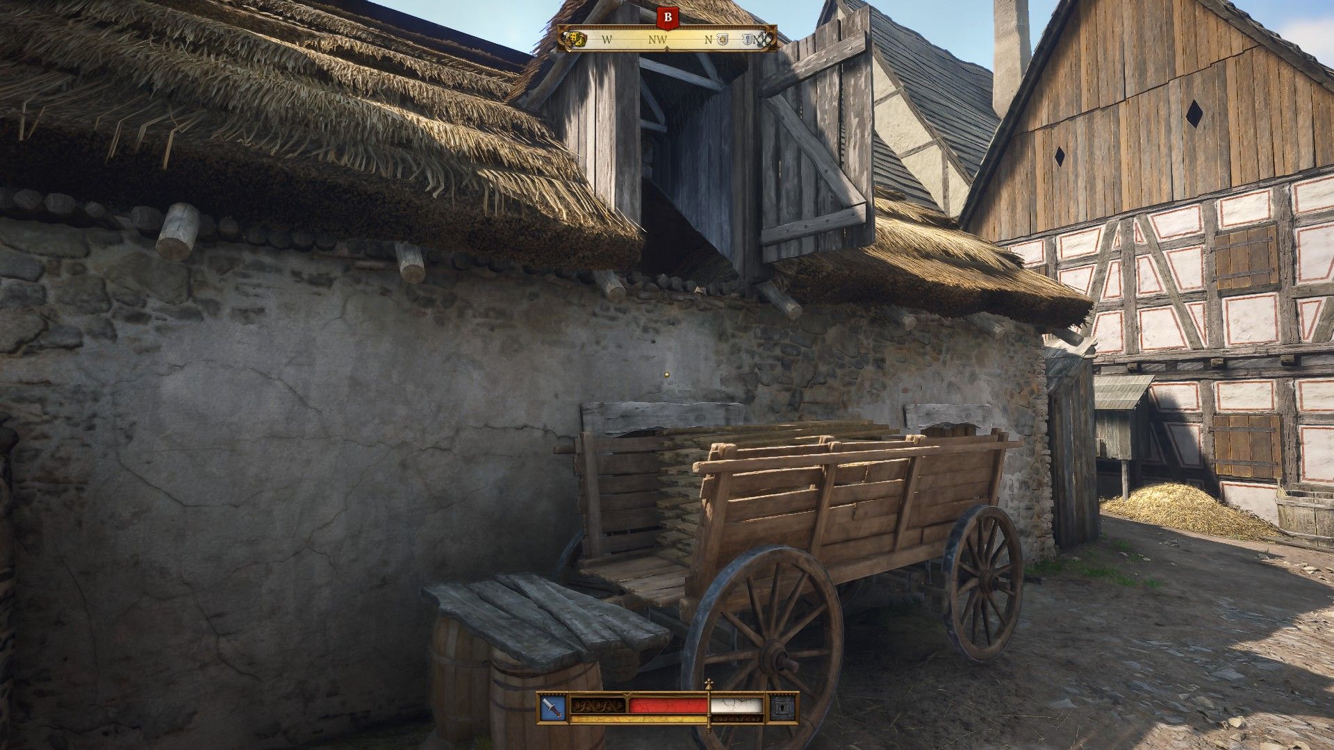 If you prefer not to play cards with Udo, you can proceed directly to a location marked on your map following your conversation with Chenyek. This spot is the backyard of the tailor’s shop. Look for a worn-out fence and jump over it. Enter the barn, then make your way upstairs. Traverse the barn and exit back outside. Jump over the wagon and pass through the doorway to locate Goatskin. Remember to carry some extra Groschen as you might need them if Goatskin refuses to talk.