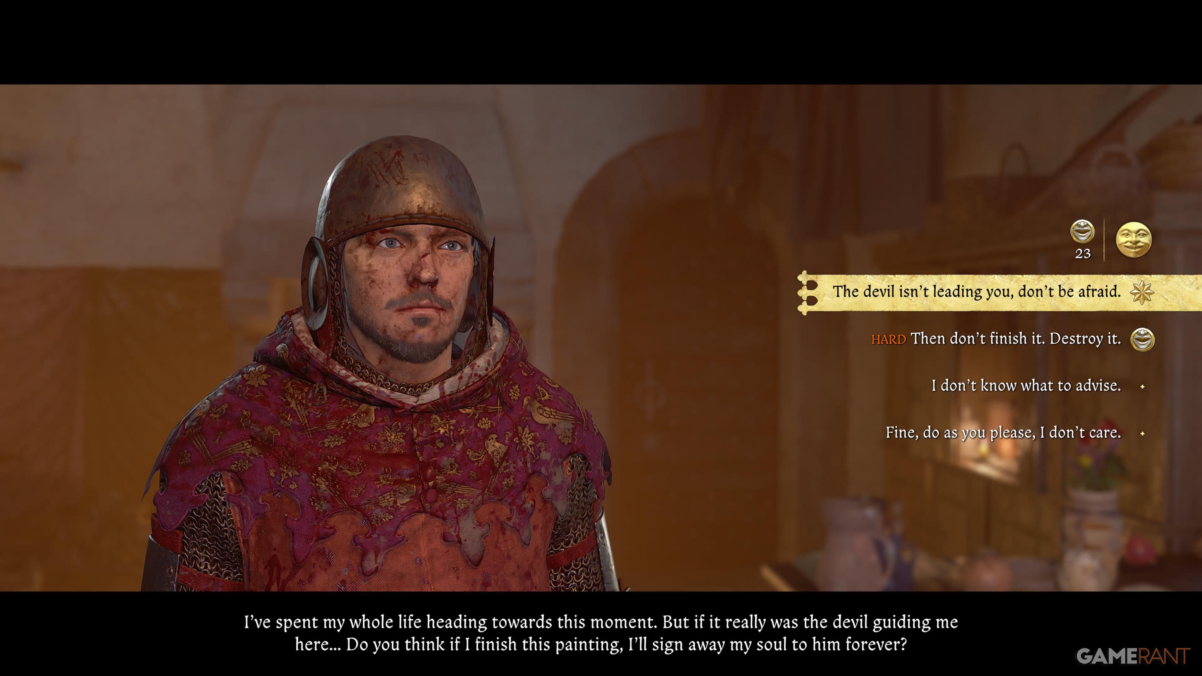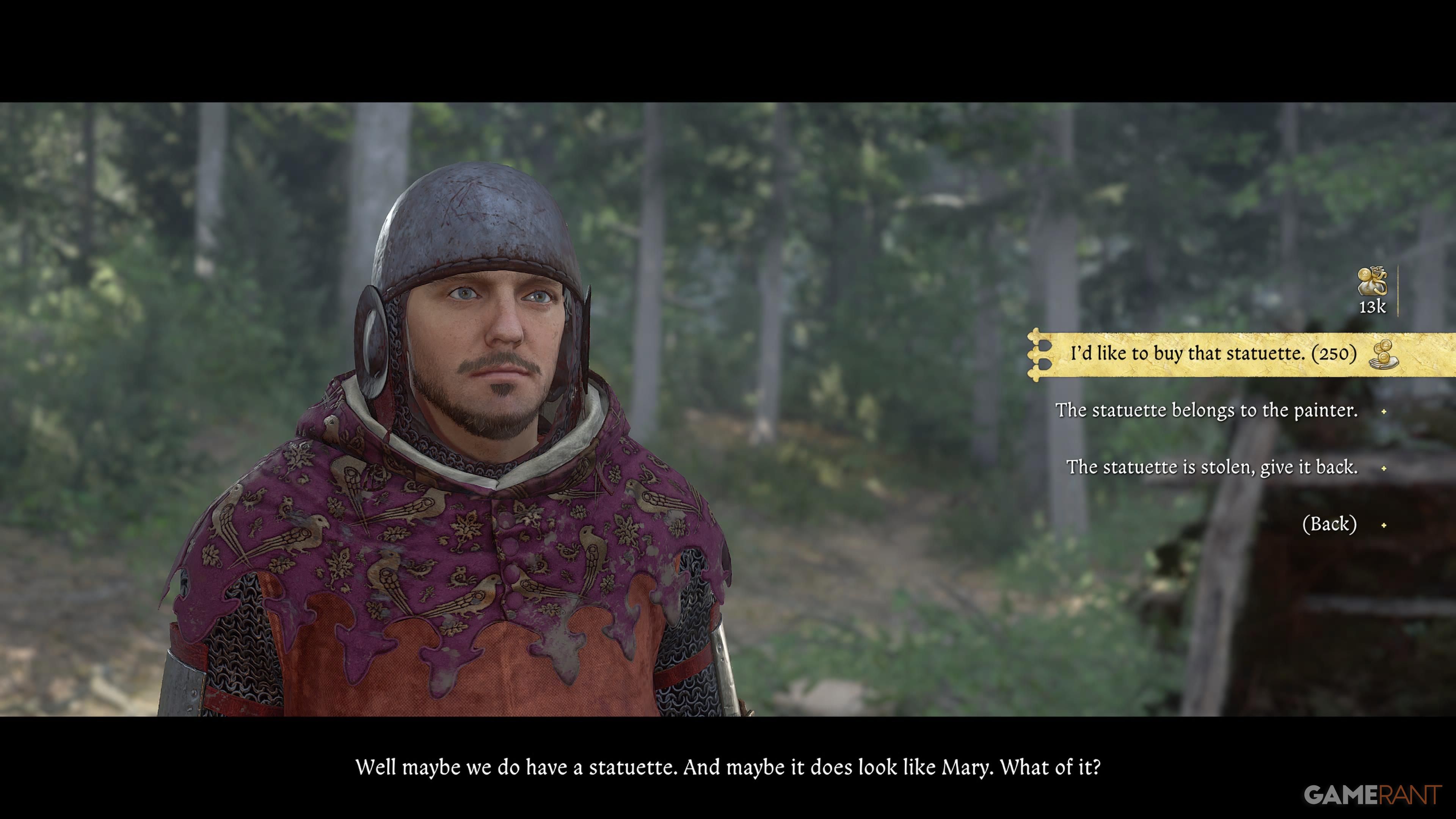 Return to the artist and deliver the Mother Mary figurine. During this chat, you may encounter a Speech Check as your second choice. Be mindful, as the dialogue’s outcome will significantly impact the DLC. Opting for the first choice enables the painter to complete the artwork, resulting in acquiring the Painter’s Muse. On the other hand, successfully passing the Skill Check on the second option leads Henry to propose that the artist destroys the painting. This ending does not result in gaining the Painter’s Muse.