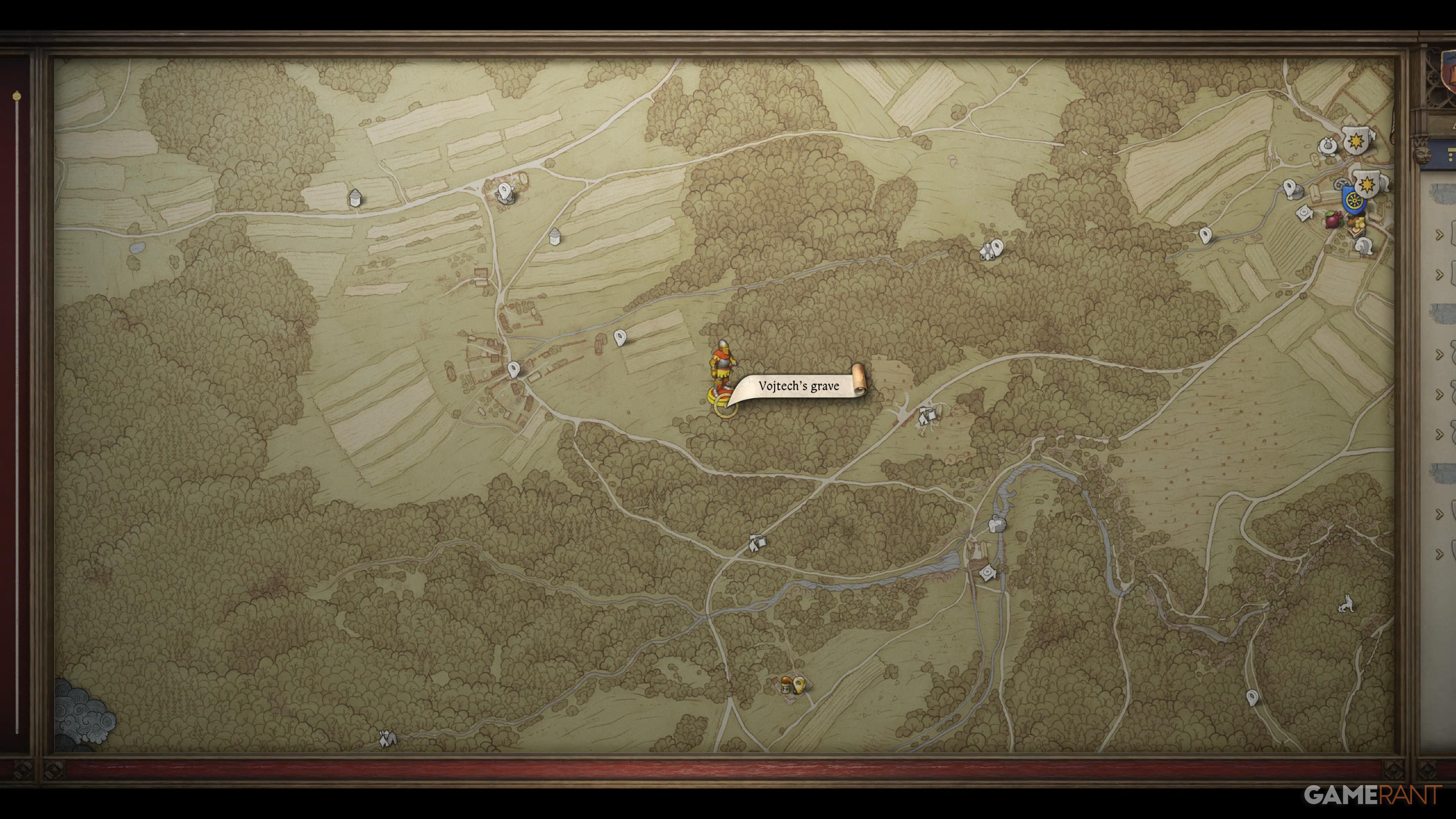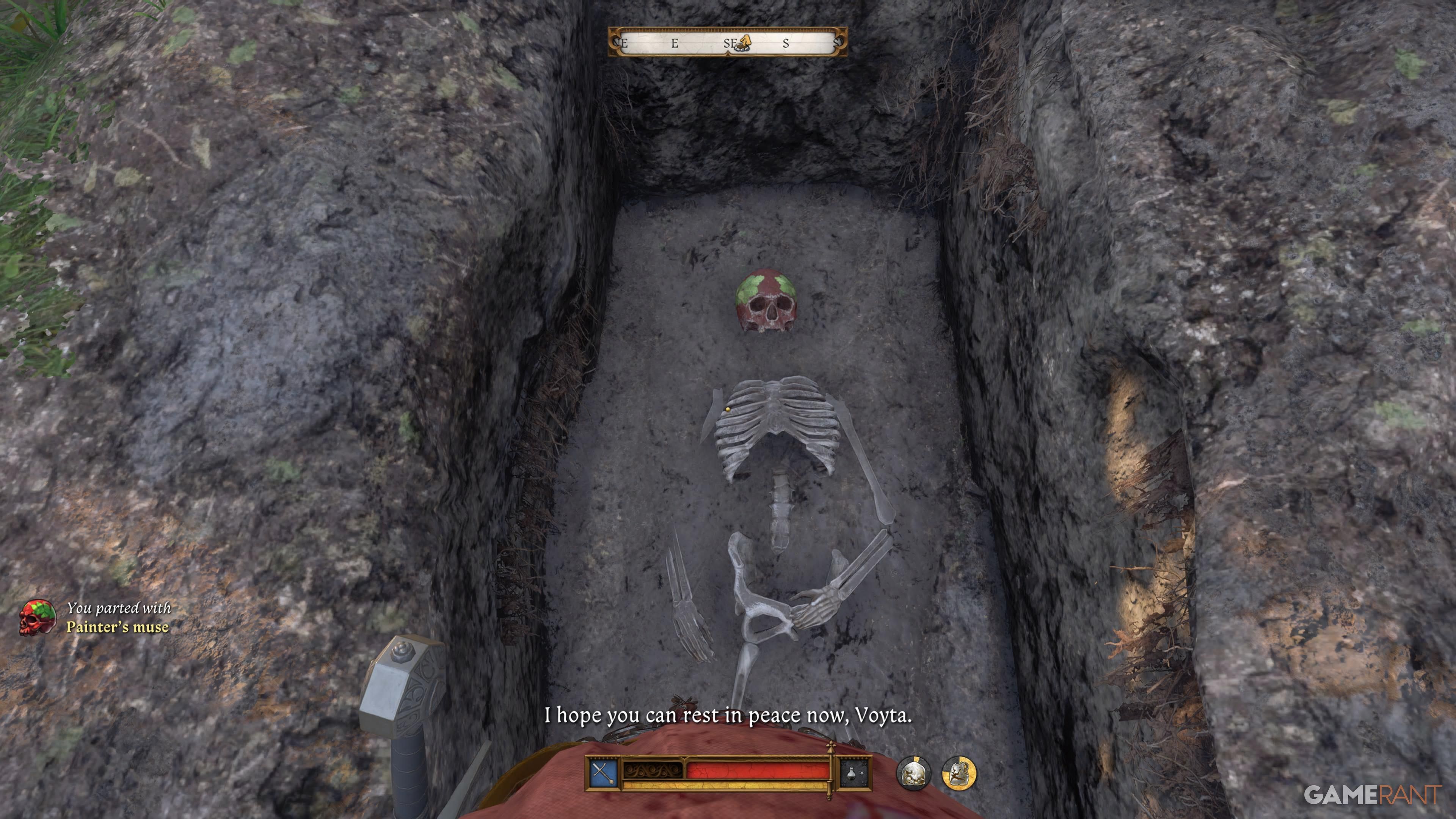 Once you complete the painting and reach the standard conclusion, you’ll obtain the Painter’s Muse – Voyta’s skull. With this artifact, you can now quickly teleport to Bylany. Proceed west towards Voyta’s grave, and there, you may dig the grave. Interact with the skeleton to replace the skull, and doing so should trigger the trophy achievement.