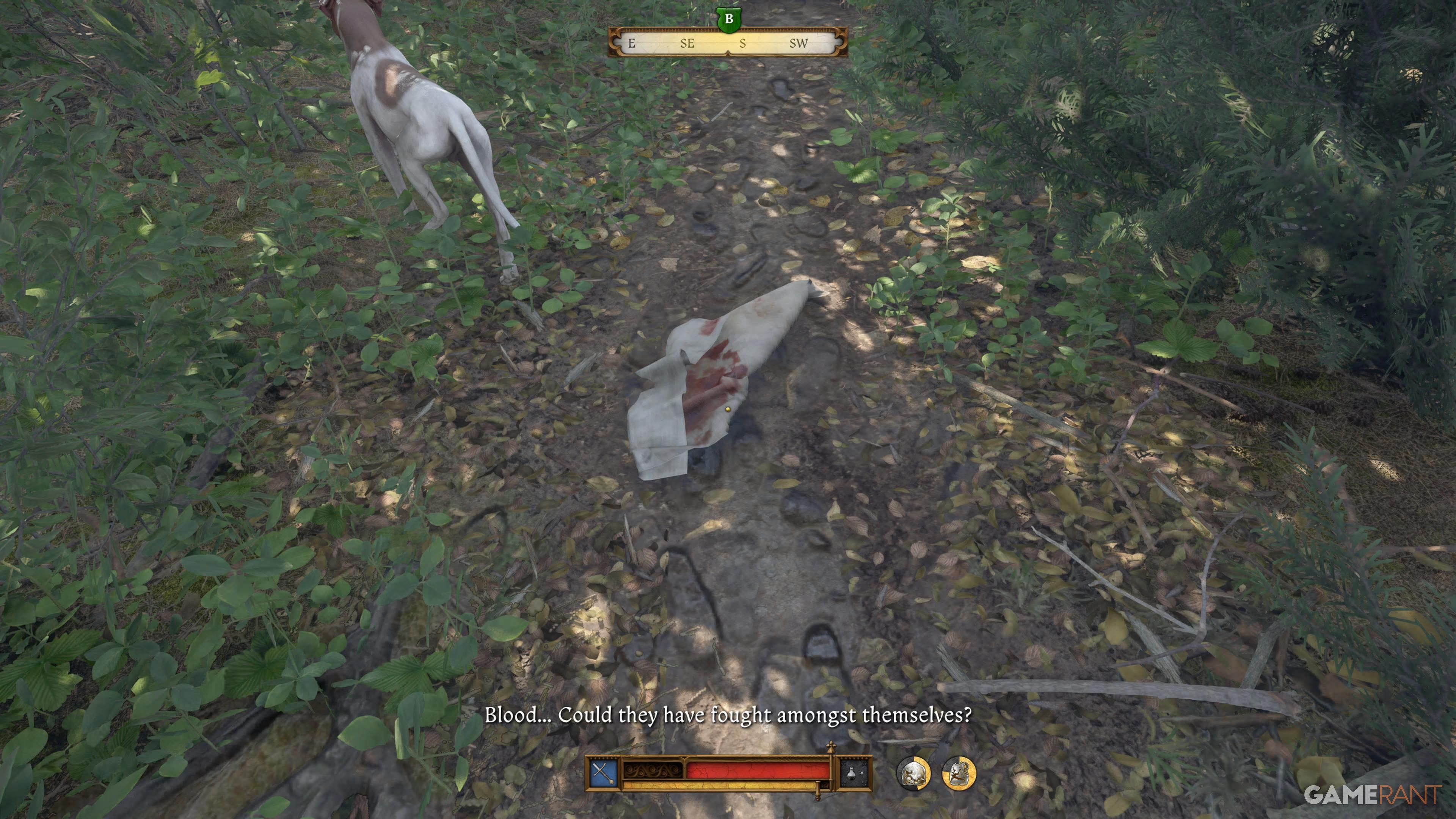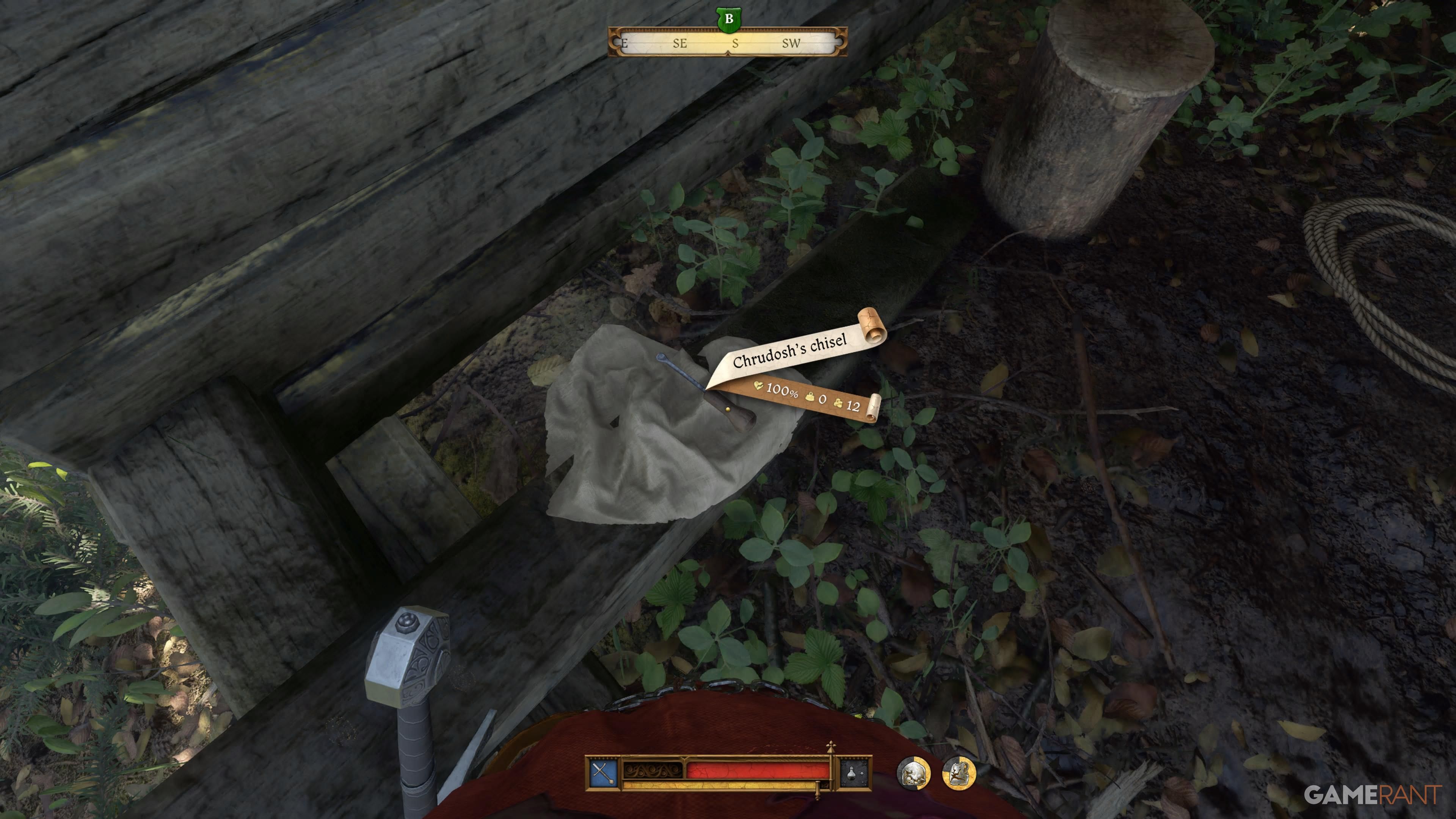 Your task is to locate the carved figurines yourself, so you’ll need to fast travel to Maleshov and then head in a northeasterly direction. Upon reaching your destination marked on your map, you will come across an abandoned house where Chrudosh’s chisel can be found inside. Look into the bloodstained cloth to one side of the house and move southeast. You will find another bloodstained cloth, which indicates that you are on the correct path, allowing you to continue moving southeast until you reach an Enemy Camp.