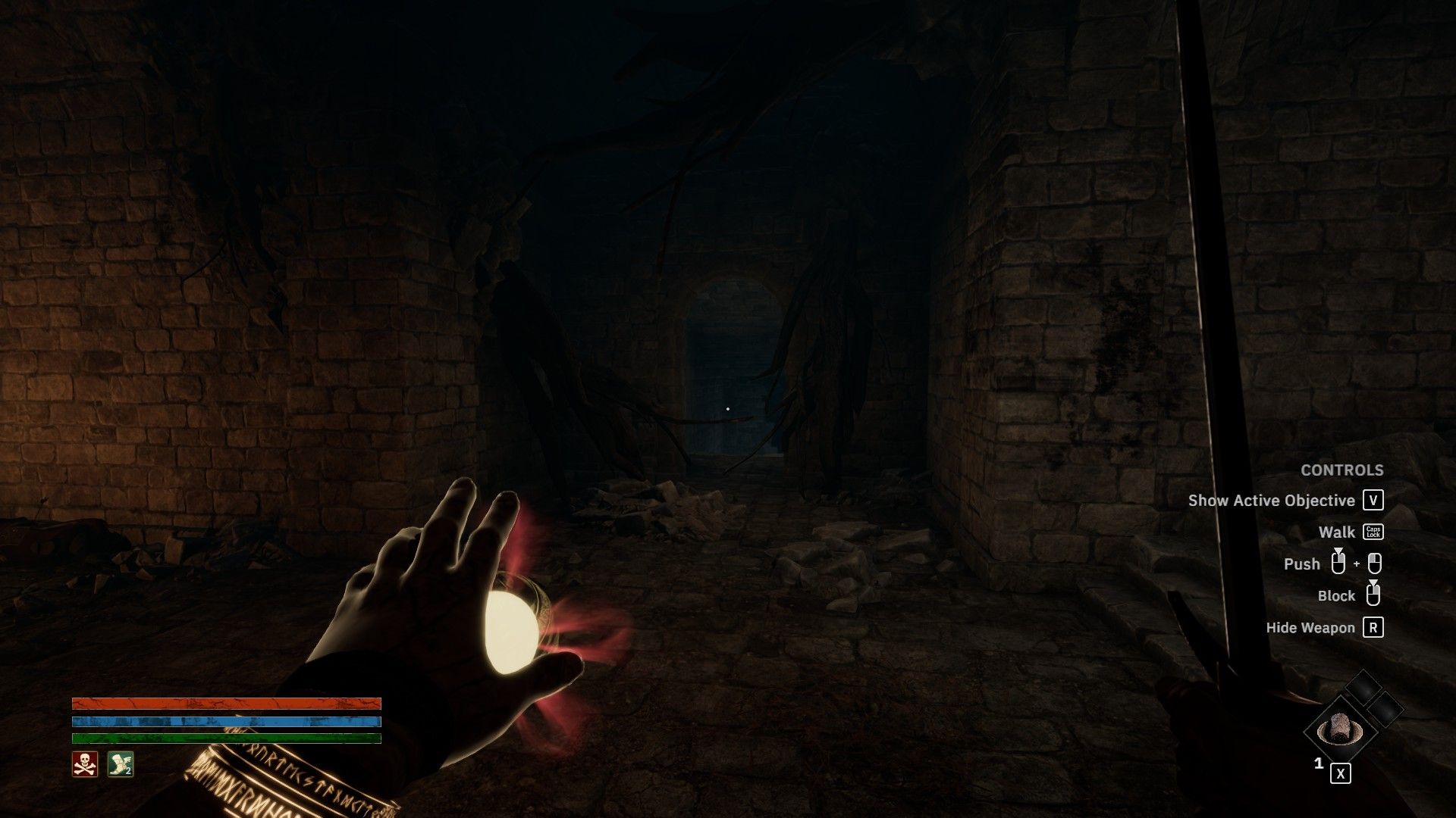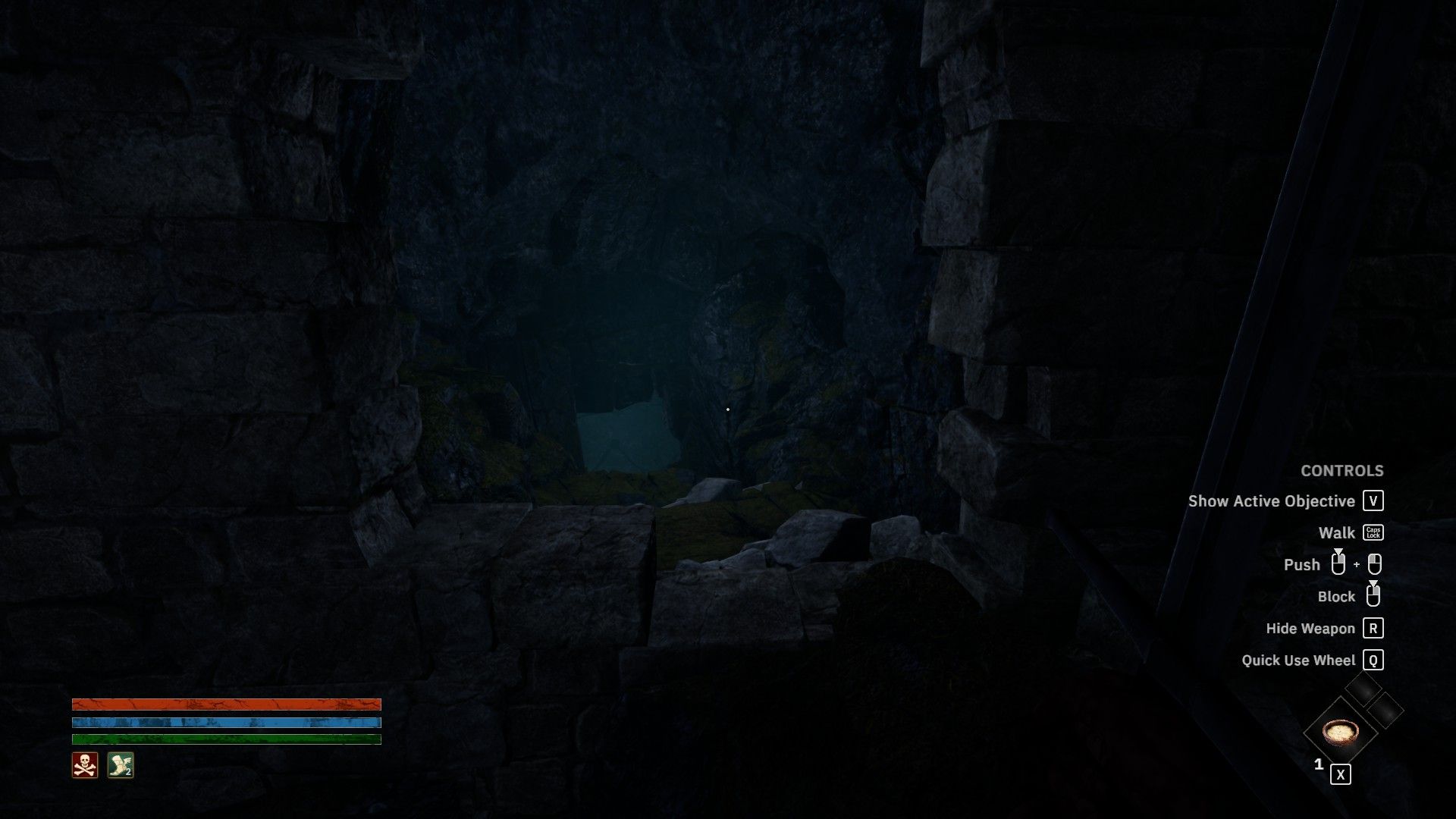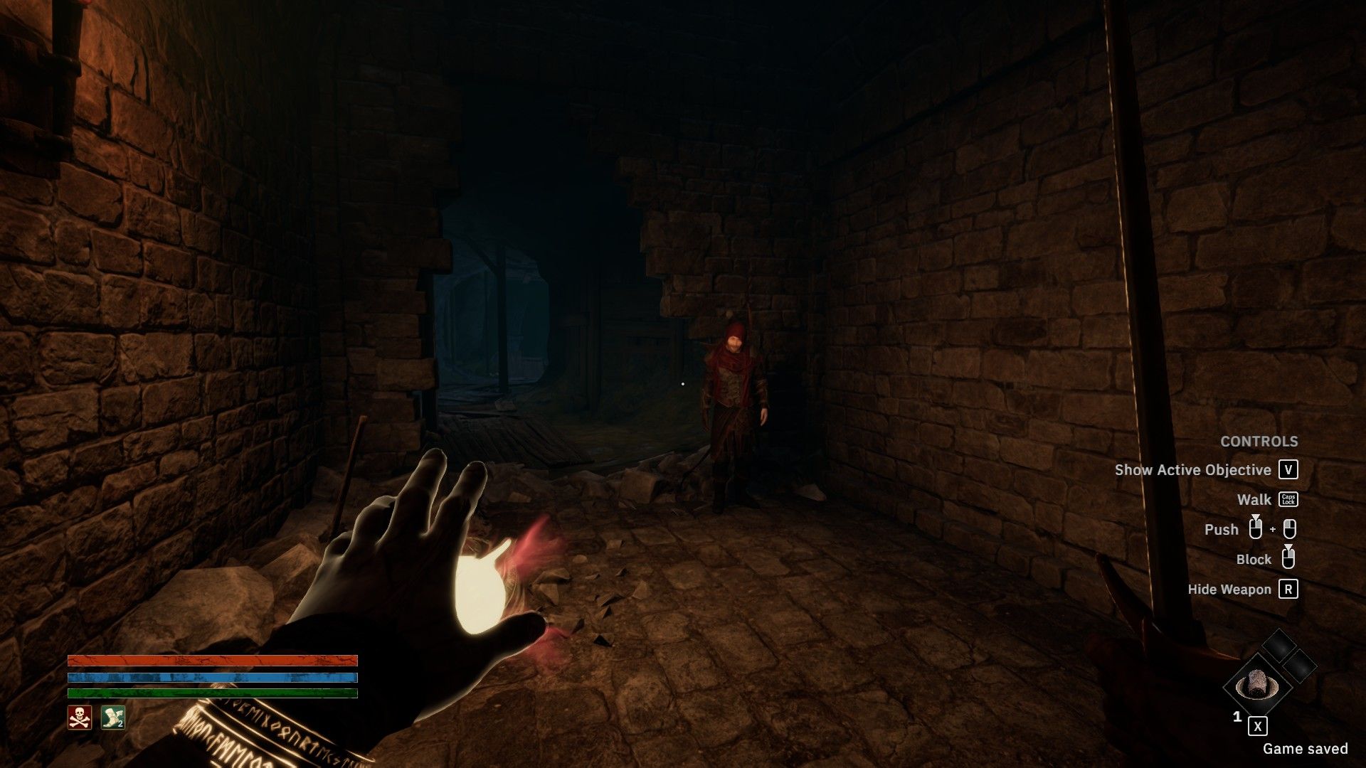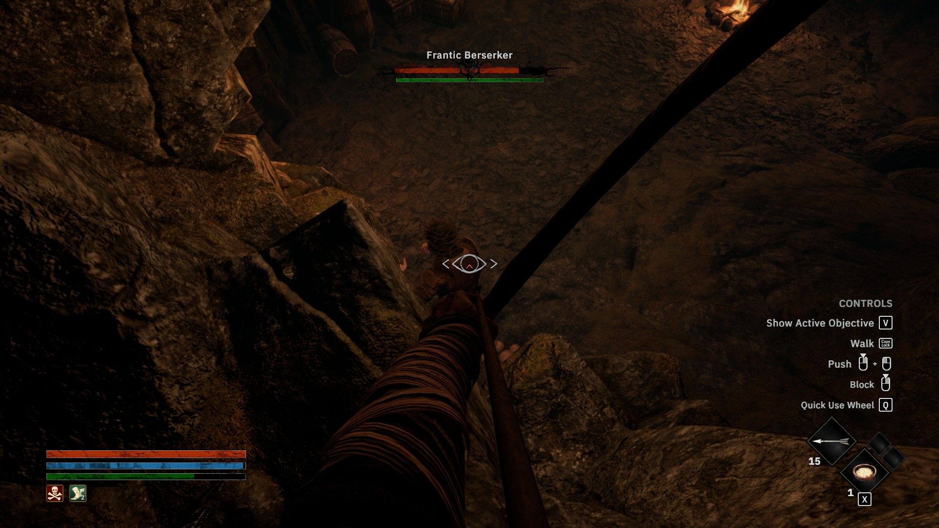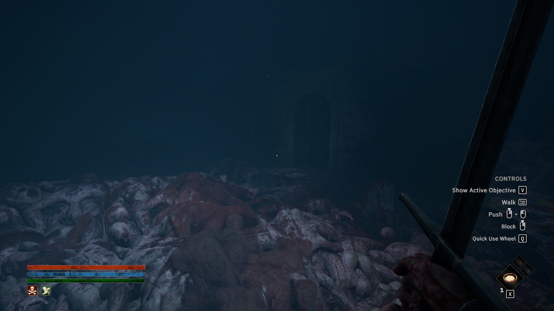 Investigate the entire asylum until you get to where Caradoc is stationed by a wall opening. Retrieve the bow and arrows from the deceased person near the fire, afterwards, proceed to the opposite side from where Caradoc stands. Follow this path, and you’ll encounter your first secretive boss along the way.