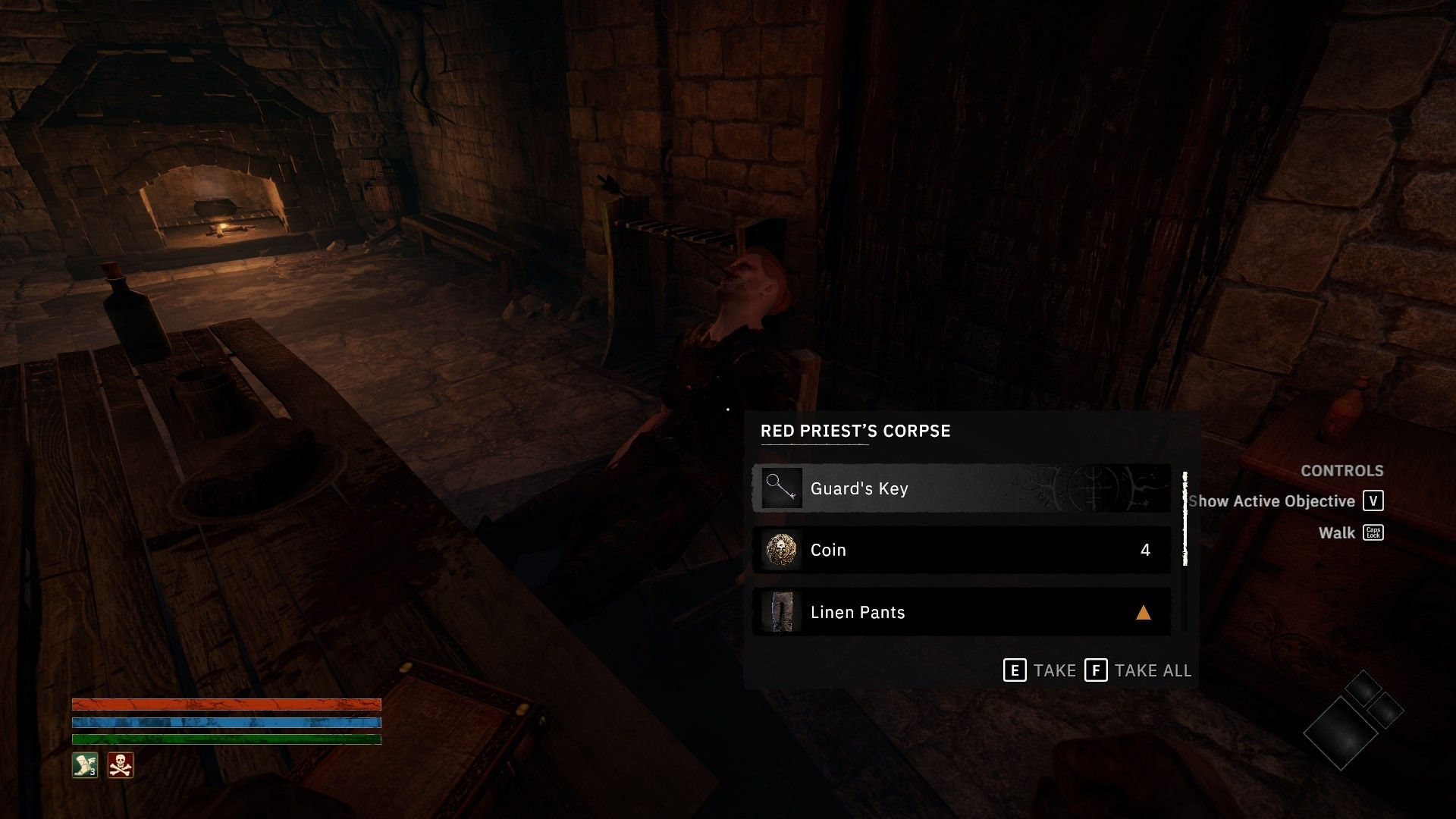 In the asylum, you’ll find two mini-bosses, but before venturing into their chambers, you’ll require the ‘Guard’s Key’. This crucial item can be found on the body of a deceased guard located to your right from your initial cell. Once Caradoc liberates you, proceed in a right direction, then continue along the hallway. You’ll find the keys on a corpse, and don’t forget to gather lockpicks, useful ingredients, and a meal recipe from nearby tables and containers as well.