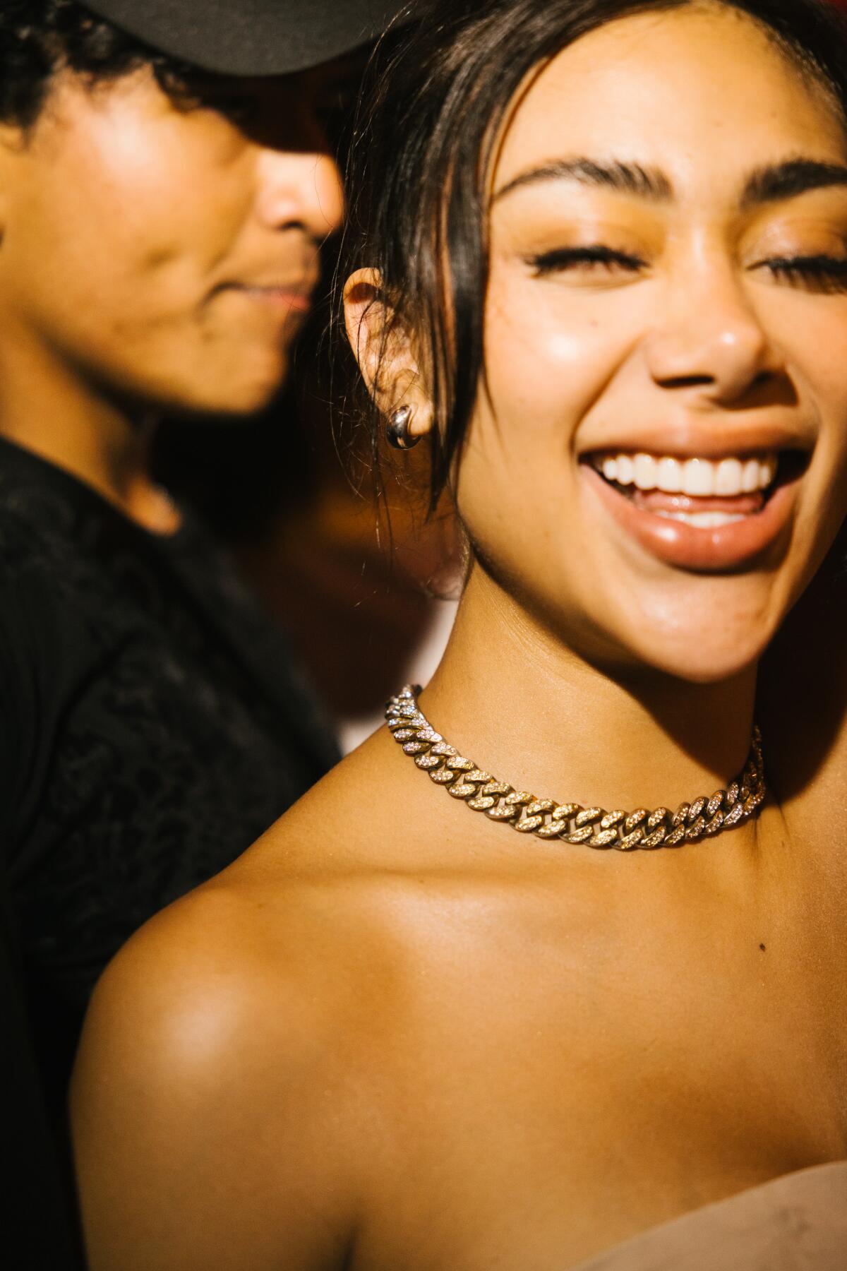 1. A dancer is adorned with a diamond necklace while dancing at Los Guitarrazos.