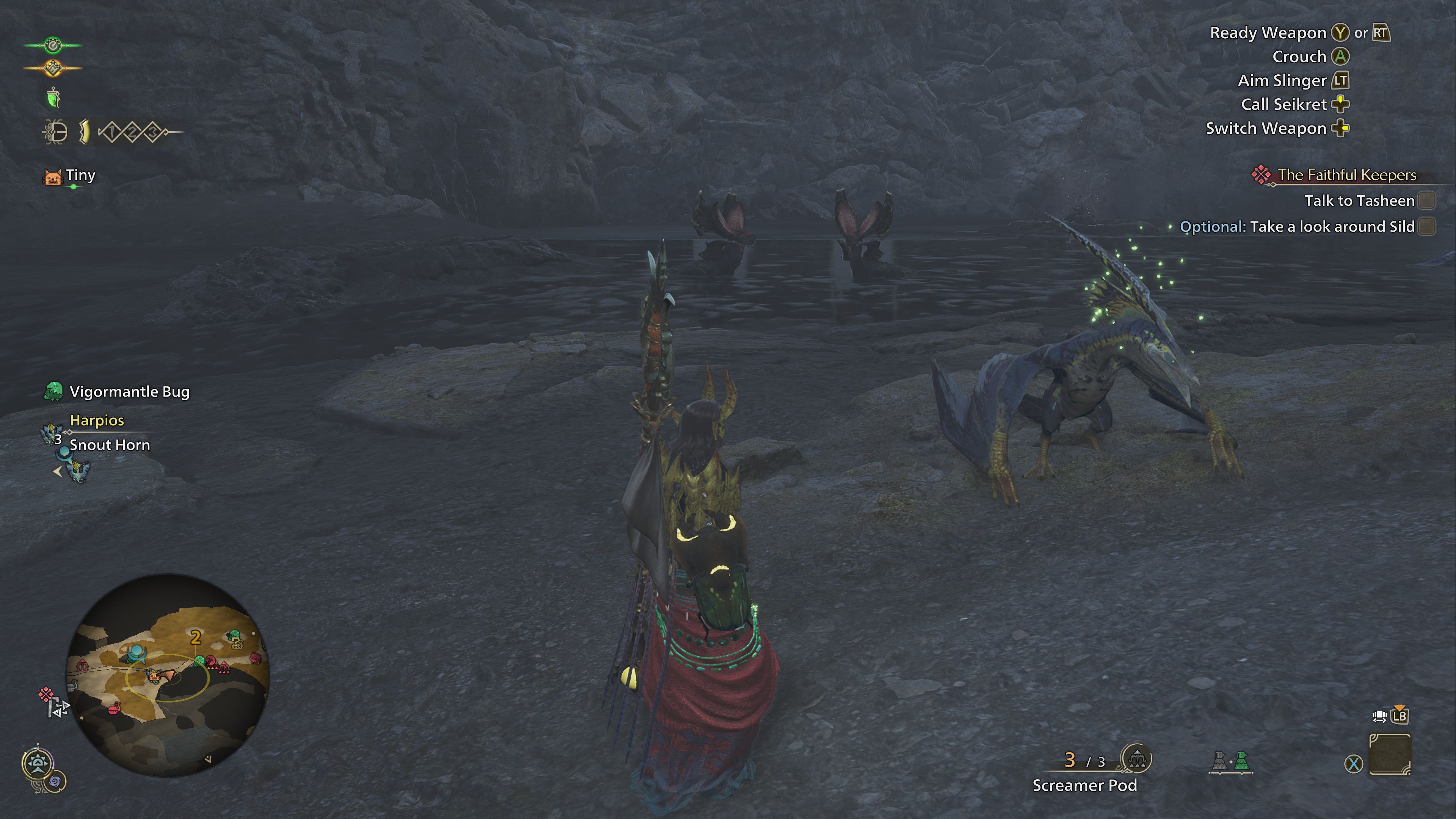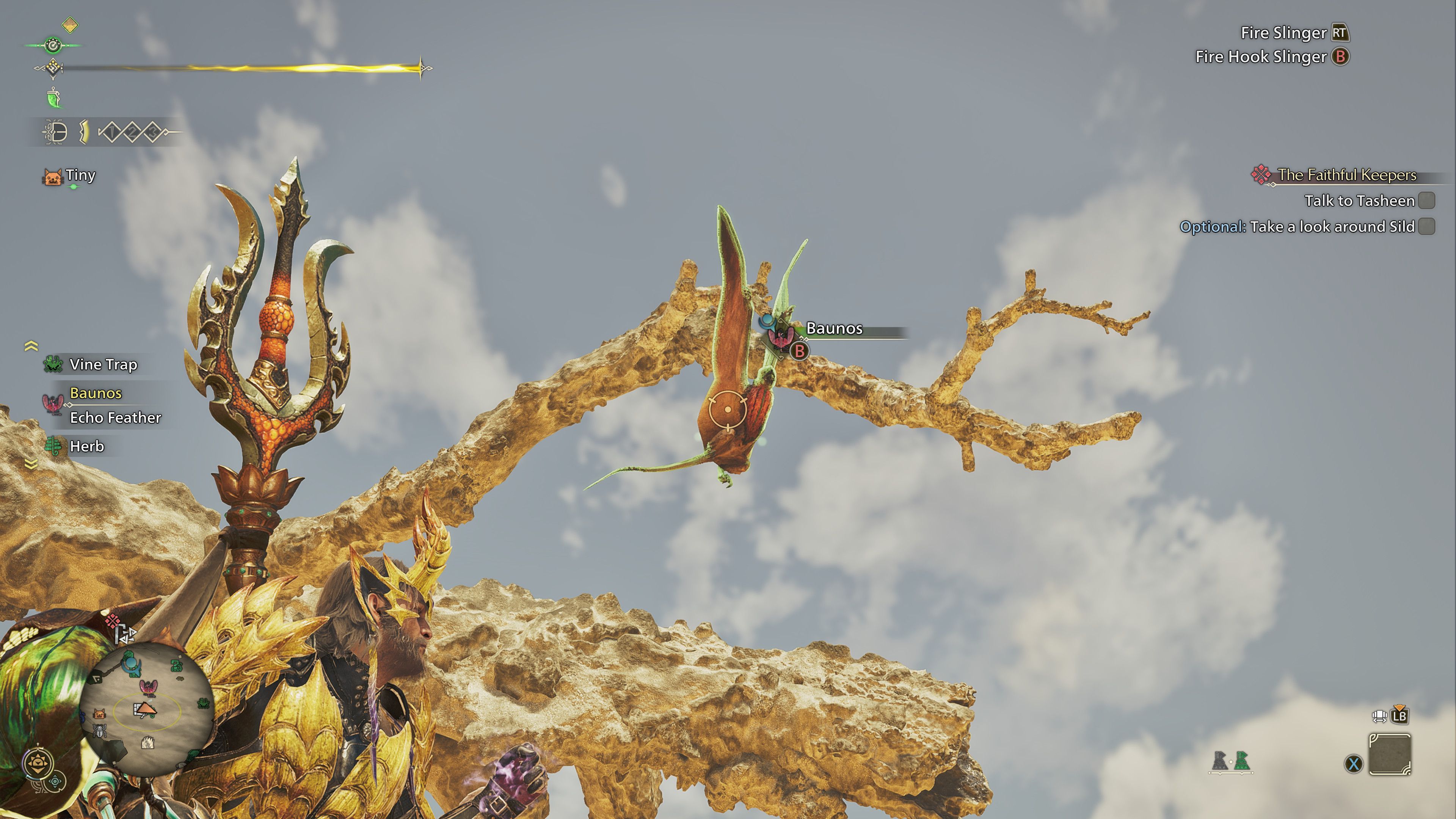 When you spot a Baunos, aim your Slinger at it and wait until it’s within range. A prompt will appear above the monster for you to press. This action will make the Baunos drop down. After that, feel free to use any weapon from Monster Hunter Wilds to defeat this small creature. Finally, carve its remains to get a Wingdrake Hide.
