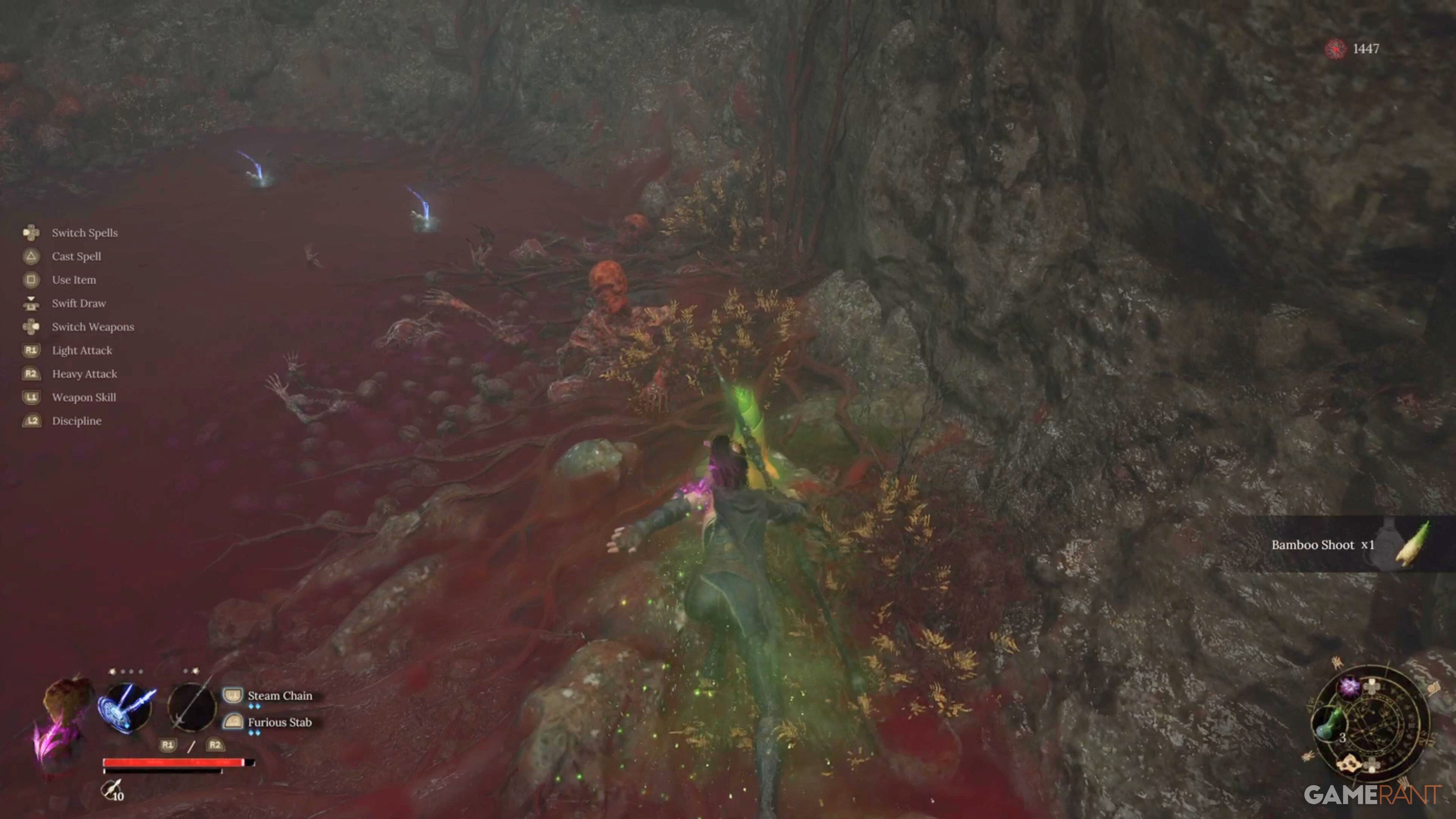 | 5 | Doomwillow Beach (Worship’s Rise) | From the Shrine, head straight past the enemy, ringing the bell. When you reach a blood river, head left and go up the path on the left when you reach the fire. At the end of the path, there should be a ladder that takes you to a Corpse Tree, which you can kick down. After talking to the Red-Clad Lady NPC on the other side, head down, and as you approach the passage up ahead, turn around and go across the path on the right. Before the path ends, you’ll spot a Bamboozling. |